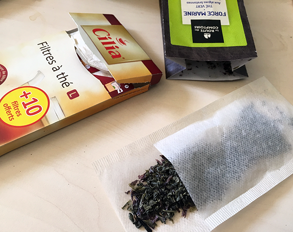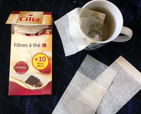 Il existe aussi des filtres réutilisables en tissu qu’on appelle aussi chaussettes à thé. Je m’en étais acheté un en Allemagne mais j’ai arrêté de l’utiliser parce que j’avais du mal à le nettoyer (et puis je crois bien que je l’ai perdu surtout). L’autre inconvénient est que les odeurs (pour les thés parfumés) et les couleurs teintent rapidement ce filtre. Si vous en voulez quand même un, vous pourrez en trouver notamment au Palais des Thés ou chez Comptoirs Richard.