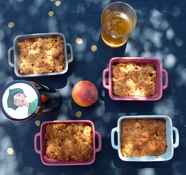 Disposez les pêches au fond de quatre petits plats (ou d’un grand). Recouvrez de la pâte à crumble et faites cuire 30 minutes dans un four préchauffé à 180°C.