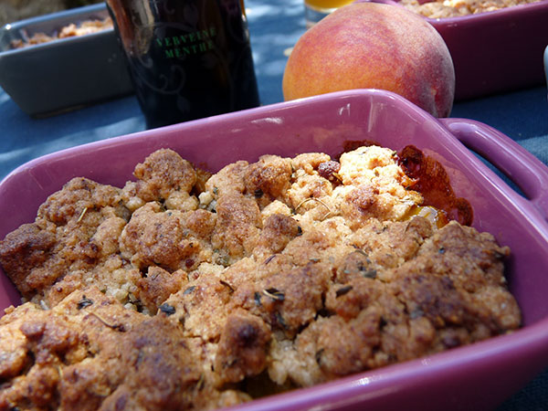 Crumble d’été aux pêches parfumées à la verveine et à la menthe