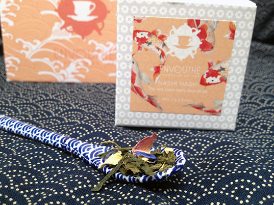 Envouthé nous propose son habituel création. Nashi Nashi est un thé vert à la poire nashi et à la fleur de lys. N’ayant jamais mangé de poire nashi, je ne peux pas vous dire si le goût est bien retranscrit. Mais ce thé à la fois fruité et fleuri m’a bien plu.