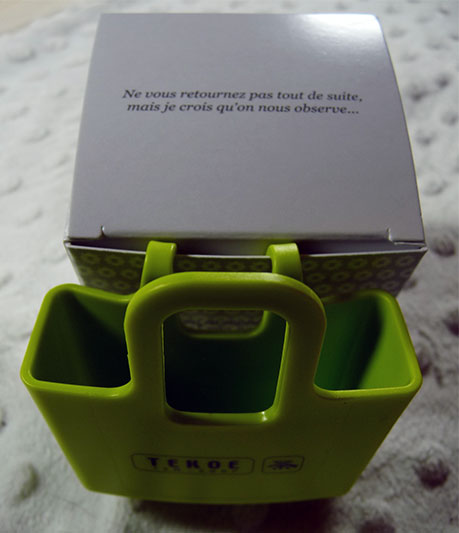 Ce mois-ci pas de gourmandise mais un goodies : un repose sachet aux couleurs de la marque. Ce petit cadeau est parfaitement adapté au thème du thé à emporter. Mais il n’y a aucun thé en sachet dans cette box pour l’utiliser ! Et le principe de Tekoe, c’est le thé en feuilles à emporter. Un petit infuseur « de voyage » aurait été plus approprié. En plus, on avait déjà eu un porte-sachet il y a deux-trois mois pour la box de Noël !