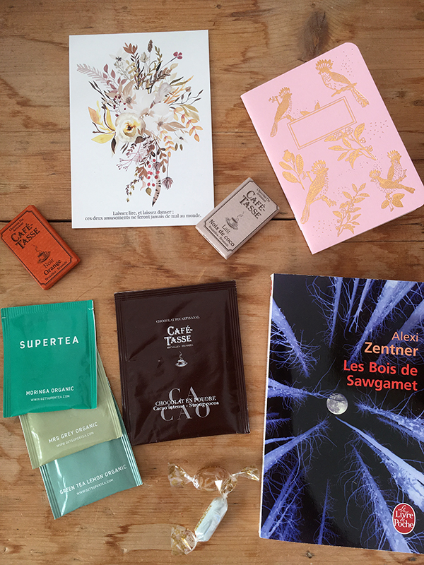 Exploratology fonctionne sur le principe d’un abonnement (ouiiii une box). Tous les mois, vous recevez dans votre boite aux lettres un carton fermé par du joli scotch (c’est tout bête mais j’adore). Et dans ce carton ? Un livre (ou plusieurs selon l’abonnement que vous choisissez), des sachets de thé, des petits bonbons, des jolies cartes, voire parfois un petit cadeau supplémentaire comme du chocolat ou un petit carnet. Le contenu parfait non ?