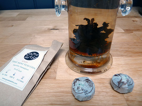 Les malignes ont commencé par un Pu Er assez léger pour m’attirer et faire tomber mes barrières. La suite s’est révélée un peu plus compliquée avec deux mini Tuo Cha en forme de nids d’oiseaux à faire infuser dans une petite théière en verre pour profiter du spectacle des feuilles qui se déploient (la mienne vient aussi de chez Goutte de Thé et est idéal pour faire infuser de multiples fois ses thés).