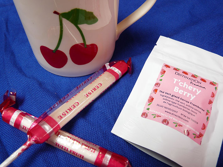 Je découvre Destination, une marque qui vend thé, café et cacao, tous issus de l’agriculture biologique. Ce sachet de T’cheri Berry, un thé vert à la cerise et à la framboise à déguster glacé, est un vrai délice. Il a un goût de grenadine mais en beaucoup moins sucré. La Thé Box nous propose également une recette de glace à l’eau (ou plutôt au thé) à faire avec ce T’cheri Berry. 10g de thé à faire infuser pendant 20 minutes, 80g de framboises et de fraises coupées en petits bouts et quelques cuillerées de sirop d’agave : après quelques heures au congélateur, c’est délicieusement rafraichissant.