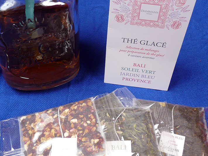 Comme on est en été, Splash ! nous offre également quatre sachets de thés glacés Dammann : Bali, Soleil Vert, Jardin Bleu et Provence. On peut tout à fait faire du thé glacé avec son thé habituel mais l’avantage de ces sachets est qu’ils sont parfaitement dosés pour obtenir le goût idéal. Jardin Bleu est un de mes thés noirs préférés, à la fraise et à la rhubarbe. Je me suis donc empressée de le tester en version glacée et je n’ai pas été déçue. Il faut que j’essaie Bali qui est déjà très frais en version chaude, il doit donc être délicieux glacé. Pour les deux autres, ce sera une découverte !