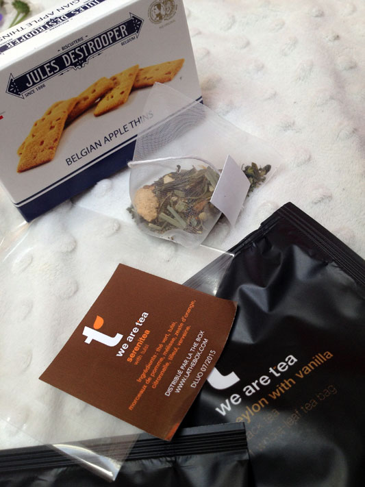 - Pas de goodies mais deux gourmandises : un petit pot de confiture Dammann à l’Earl Grey que je vais devoir cacher si je ne veux pas que mon amoureux mange tout et des sablés aux pépites de pommes signés Jules Destrooper absolument délicieux.