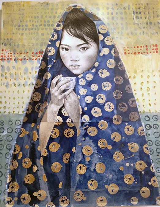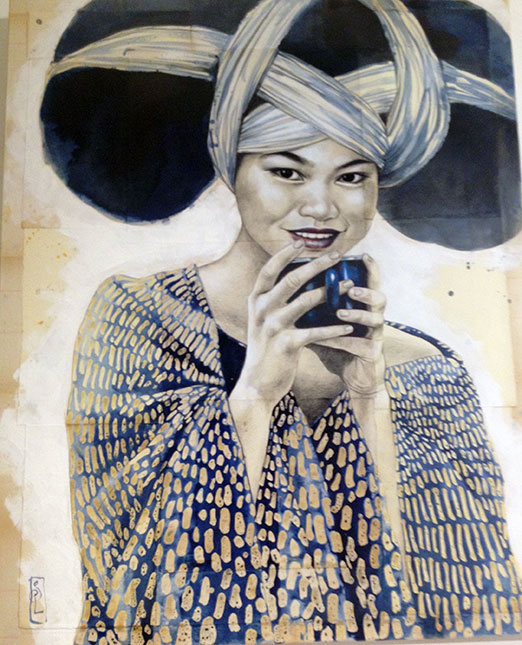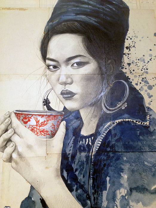 L’Essence du Thé, le salon de thé-boutique des Thés George Cannon, a eu l’excellente idée de lui commander une exposition sur le thé. En pleine période indigo, Stéphanie Ledoux nous propose une série de portraits fascinants, bleus et théinés.