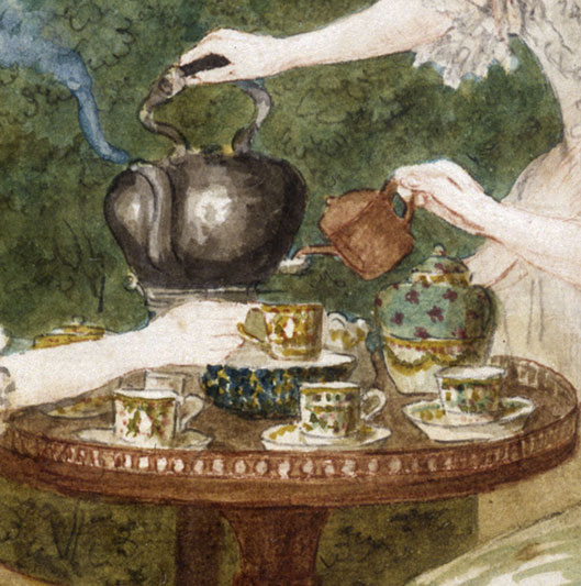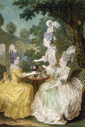 - Détail © Musée Carnavalet Mme la Marquises Montesson, Mme la Marquise du Crest et Mme la Marquise de Damas buvant le thé dans un jardin – Carmontelle
