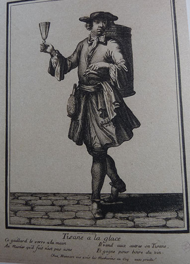 Une petite salle présente des documents qui m’ont fait rêver. On peut y voir le Traitez nouveaux et curieux du café, du thé et du chocolate, un ouvrage datant de 1681, de Philippe Sylvestre-Dufour. C’est un des traités marquant dans la démocratisation de ces boissons exotiques. Penser à tous les yeux qui ont dû se poser sur cet ouvrage me donne le vertige. J’ai aussi beaucoup aimé ce portrait d’un marchand de tisane glacé.