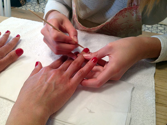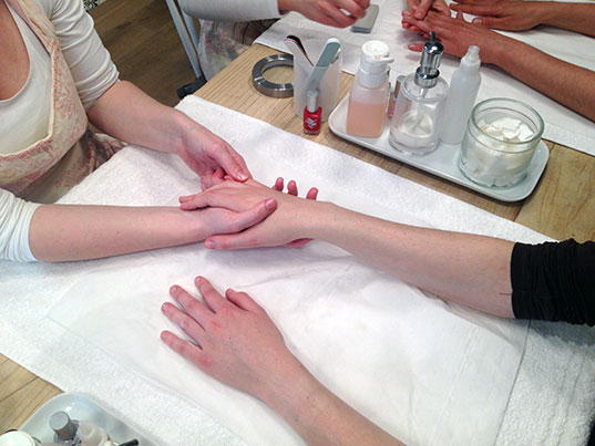 Nous avons eu la grande chance de passer entre les mains talentueuses de Julie et Marie pour une manucure au top ! Limage des ongles et coupe parfaite, modelage (moi qui ne suis vraiment pas fan de massage, je n’aurais jamais pensé qu’un modelage des mains soit aussi agréable), pose d’une crème parfumée Rose-Gin (il y a plein d’autres parfums mais celle-ci avait une odeur à tomber).