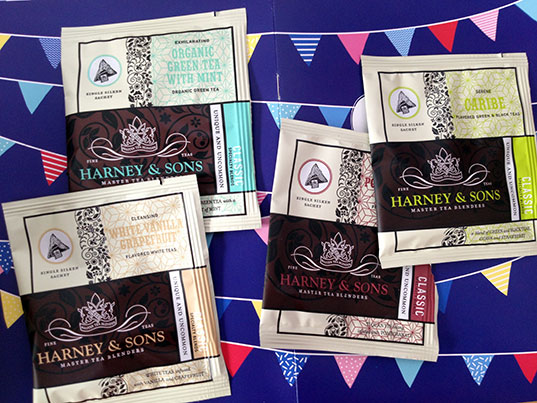 Les américains de Harney & Sons nous proposent quatre références. Pomegranate Oolong est très agréable. L’acidité de la grenade vient bien relever la rondeur du oolong. Caribe nous fait voyager avec son mélange de thés noir et vert parfumé à l’hibiscus, goyave, noix de coco et fraise. Mais je crois que je n’aime pas trop la goyave. Et c’est malheureusement le fruit qui ressort le plus dans ce thé, autant à l’odeur qu’au goût. White Vanilla Grapefruit est, comme son nom l’indique, un thé blanc à la vanille et pamplemousse. Il est très agréable, la douceur de la vanille étant rehaussée par le peps du pamplemousse.Enfin, je ne peux pas vous dire ce que j’ai pensé de Earl Grey Supreme puisque c’est un sachet de Thé Vert à la menthe qui s’est incrusté dans ma boite.