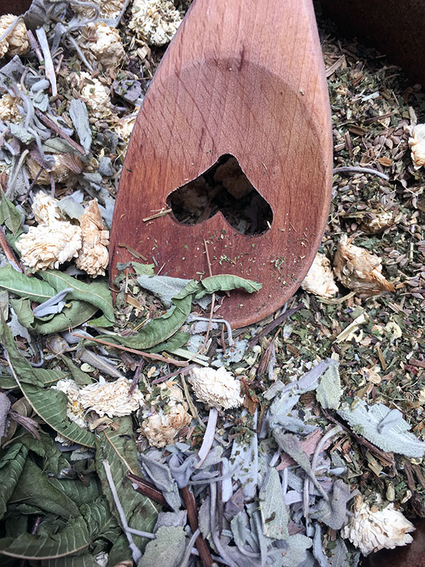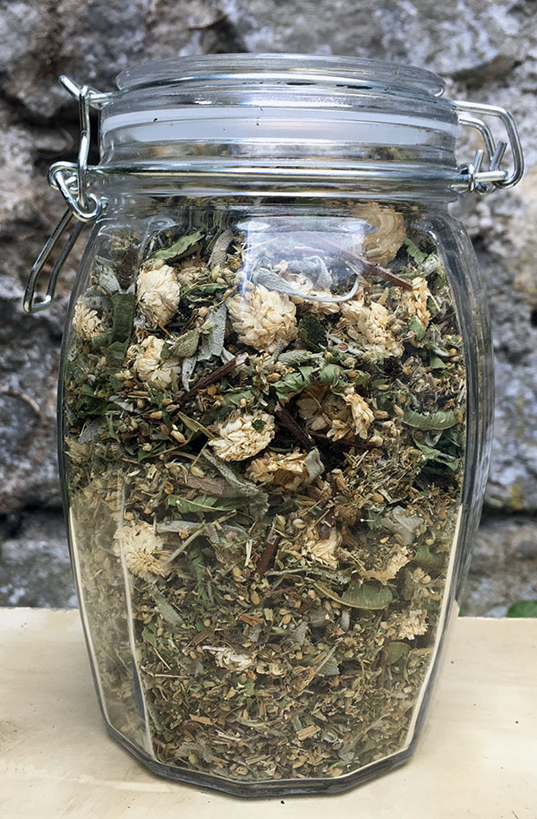 Pour réaliser votre tisane anti douleur, mélangez doucement dans un saladier 50g d’achillée millefeuille, 50g d’ortie blanche, 10g de verveine, 35g de sauge, 50g d’anis vert et 10g de camomille romaine. Comme la camomille romaine, c’est vraiment amer et pas très bon, Erbie rajoute des pommes pour donner un petit goût plus sympa. Une fois votre tisane réalisée, mettez là dans un bocal ou une boîte bien hermétique.