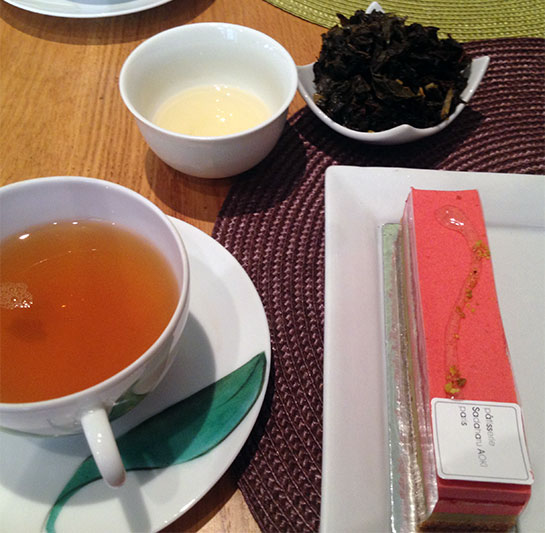 En dessert, j’ai pris une pâtisserie de chez Sadaharu Aoki, un délicieux gâteau à la framboise, très léger mais gourmand. J’ai bien sûr accompagné ce repas d’un thé : Momizi les Feuilles Mortes, un oolong très automnal (oui c’est pas la saison mais je fais ce que je veux) à la figue, coing, poire, raisin, mûre, noix, amande, cardamone et mandarine. J’ai tellement aimé que j’en ai acheté un paquet.