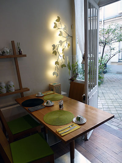 Au fond de la boutique se trouvent quelques tables où l’on peut déjeuner ou goûter selon l’heure de la journée. Les plats proposés changent régulièrement et contiennent tous du thé, d’une manière ou d’une autre. C’est Katrin Rougeventre, responsable de l’Essence du Thé et grande passionnée, qui élabore toutes ces recettes. J’ai opté pour du flan aux courgettes et matcha absolument délicieux. Ces trois petits flans étaient accompagnés d’une salade dont la sauce est réalisée avec les nouvelles huiles George Cannon, à base de thé évidemment.