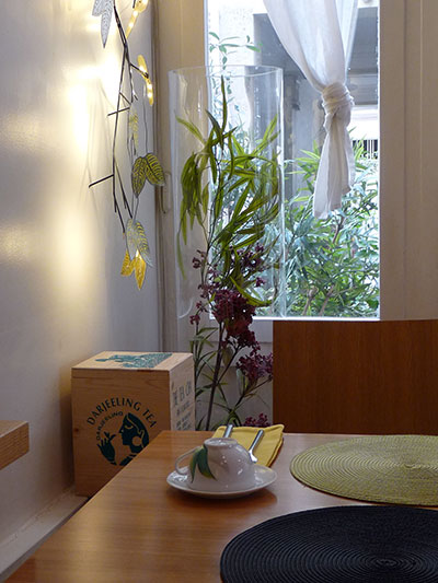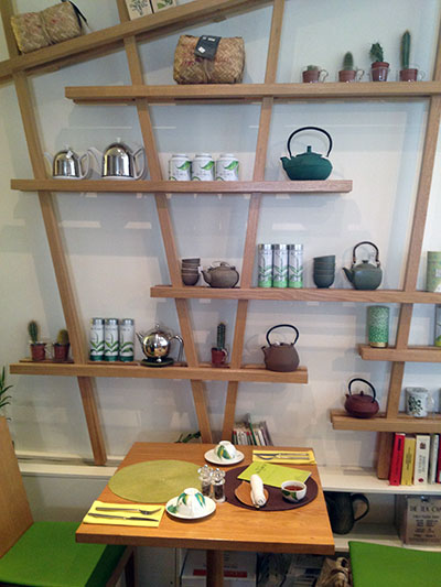 La décoration de la boutique est assez épurée, tout en bois avec des étagères sur les murs présentant des jolies tasses et théières mais aussi des livres sur le thé, notamment des poésies asiatiques.