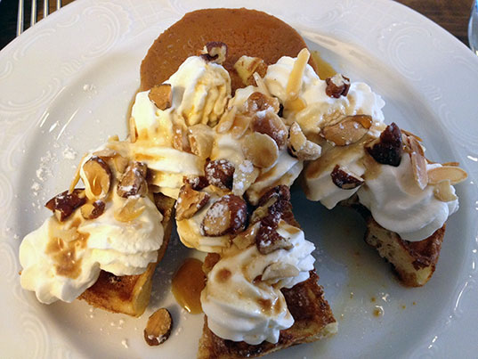 Je ne me souviens plus du nom exact de mon gâteau mais si vous allez là-bas, il faut absolument que vous y goûtiez : une gaufre surmontée de crème fouettée et d’amandes caramélisées accompagnée d’un entremet aux marrons. C’est une tuerie !