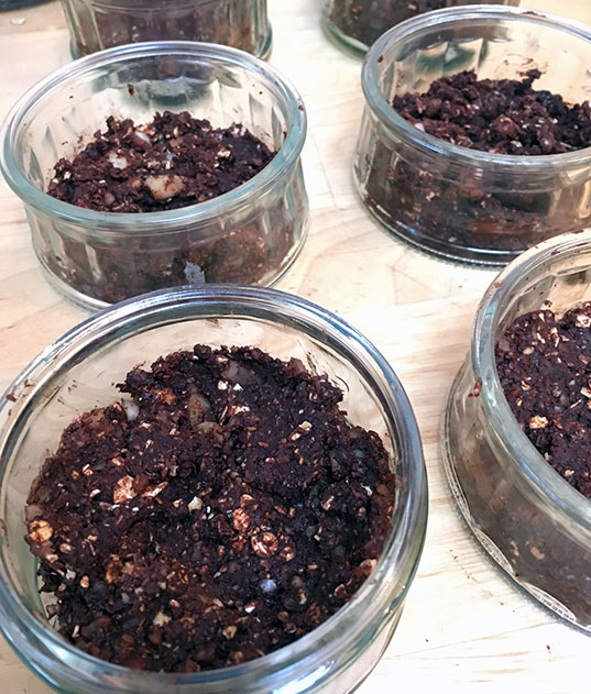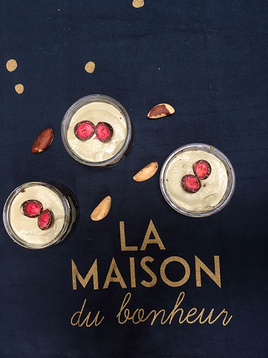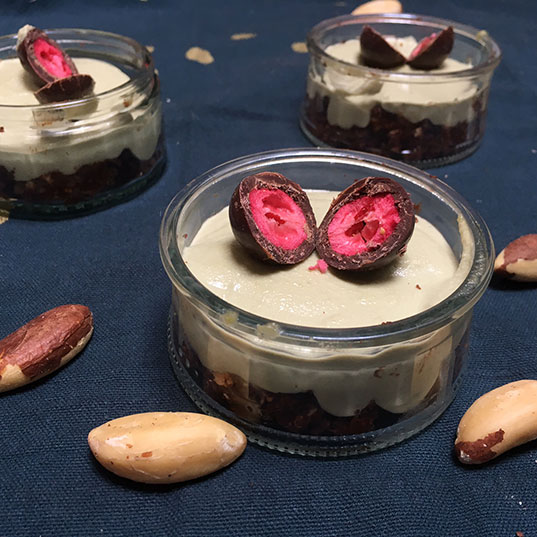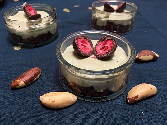 Pour réaliser le biscuit. Faites fondre le chocolat au bain-marie (ou au micro-ondes mais bon, c’est pas très vegan attitude). Mixez grossièrement les noix du Brésil au blender. Ajoutez dans le blender, tous les autres ingrédients et mélangez tout bien jusqu’à obtenir une pâte un peu épaisse (c’est normal qu’il reste des morceaux). Tassez votre pâte dans le fond des ramequins et réservez au frais.