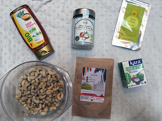 - 200g de noix de cajou (attention, des noix de cajou natures hein, pas les salées qu’on trouve au rayon apéro. Celles de Gula sont bio et parfaites)