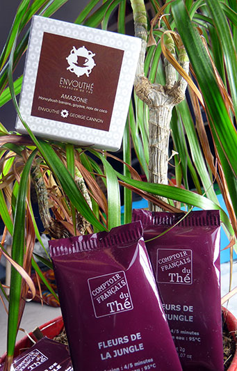 - Amazone, une nouvelle création d’ Envouthé et de George Cannon. Je ne suis jamais déçue par les créations Envouthé mais alors là, je suis complètement fan. Ce mois-ci, il s’agit d’un honeybush aux goût de banane, goyave et noix de coco. Le honeybush (littéralement Buisson à miel, miam !) est un arbuste d’Afrique du Sud, cousin du rooibos, mais avec un goût un peu plus doux. Sans théine, il peut être bu à n’importe quel moment de la journée. Cet Amazone est délicieusement doux et exotique. Je suis sous le charme.