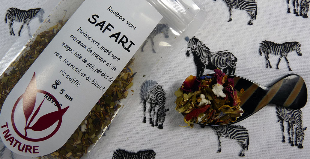 - Safari de TNature. Ce thé à l’appellation sauvage est un mélange de rooibos vert et de maté à la papaye et à la mangue. Je n’ai pas encore goûté mais l’odeur et la vue me donnent bien envie.