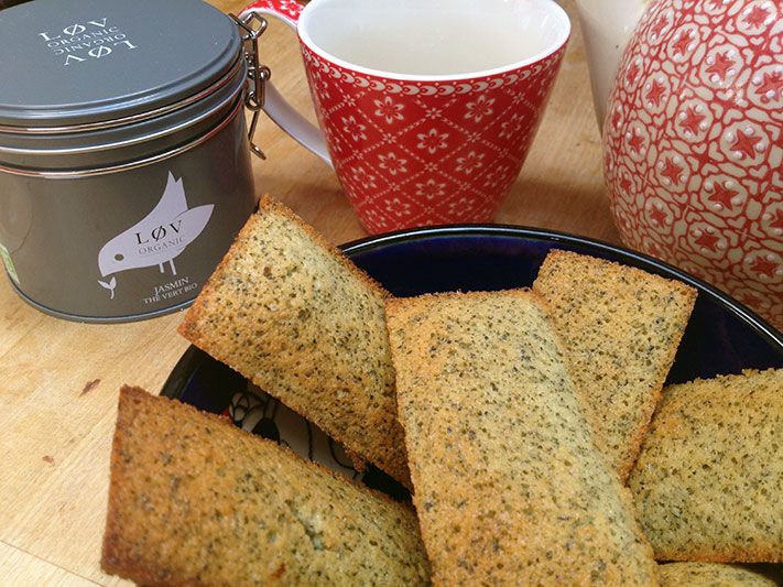 75 g de poudre d’amandes, 100 g de beurre fondu, 35 g de farine, 150 g de sucre glace, 4 blancs d’oeuf, 3 cuillerées à soupe de thé vert au jasmin