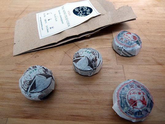 Les malignes ont commencé par un Pu Er assez léger pour m’attirer et faire tomber mes barrières. La suite s’est révélée un peu plus compliquée avec deux mini Tuo Cha en forme de nids d’oiseaux à faire infuser dans une petite théière en verre pour profiter du spectacle des feuilles qui se déploient (la mienne vient aussi de chez Goutte de Thé et est idéal pour faire infuser de multiples fois ses thés).