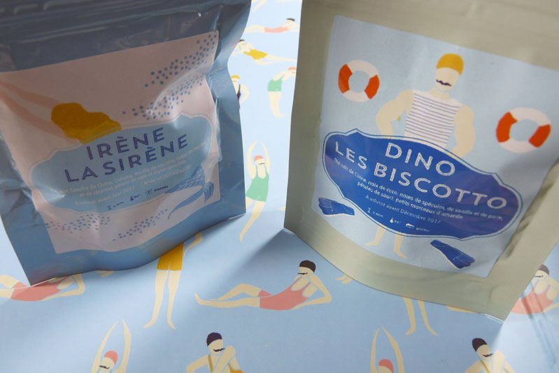 La deuxième création est ultra-gourmande. Dino les Biscotto est un thé noir au spéculos, noix de coco, vanille, poire et amandes. Je n’aime pas du tout le spéculos mais gageons qu’avec sa jolie moustache et son bonnet de bain, Dino saura me séduire.