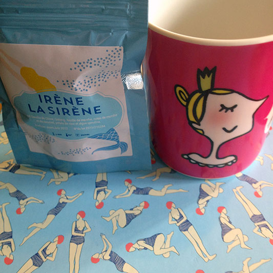 Ce mois-ci, elles sont raccord avec le thème mouillé rétro. Irène la Sirène est composée de thé vert et de Oolong à la menthe et au caramel pour un mélange frais et gourmand. Elle comprend également de la spiruline, une algue très riche en nutriments (je vous rassure, je n’en avais jamais entendu parler moi non plus avant cette box)(bon en fait, ma sœur connaît et dit que c’est dégueulasse).
