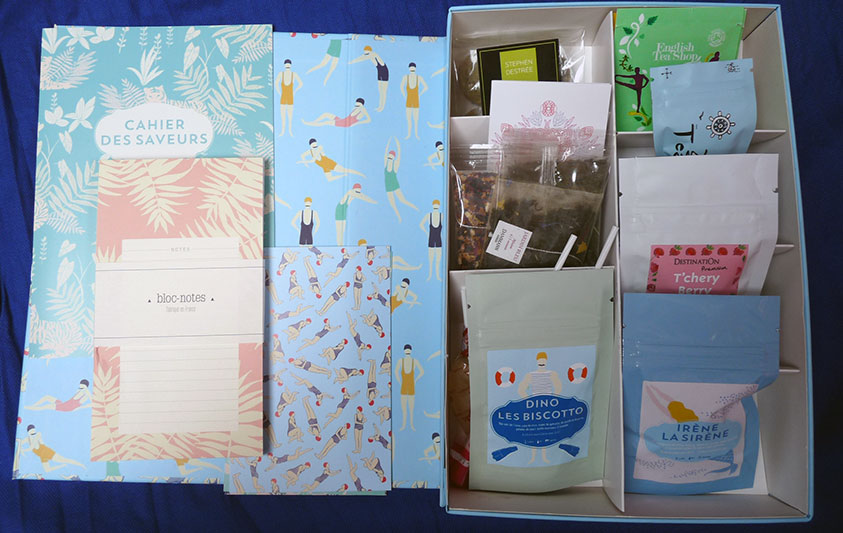 La Thé Box Splash ! a été réalisée en partenariat avec Season Paper, une petite maison de papeterie qui crée des cartes, carnets, affiches, bloc notes, etc. au graphisme gai et délicat. C’est Julie et Mélissa, les deux créatrices de Season Paper, qui ont habillé cette Thé Box de jolis baigneurs rétros.