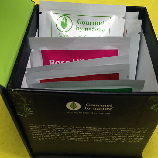 Les produits de Gourmet by nature viennent tous du Sénégal. Leurs infusions ne sont pas certifiées bios mais leur projet est très axé développement durable. Toutes leurs plantes sont cultivées, dans le cadre d’un projet agricole coopératif, de manière naturelle, sans engrais ni pesticides. L’arrosage et la récolte sont faits manuellement.
