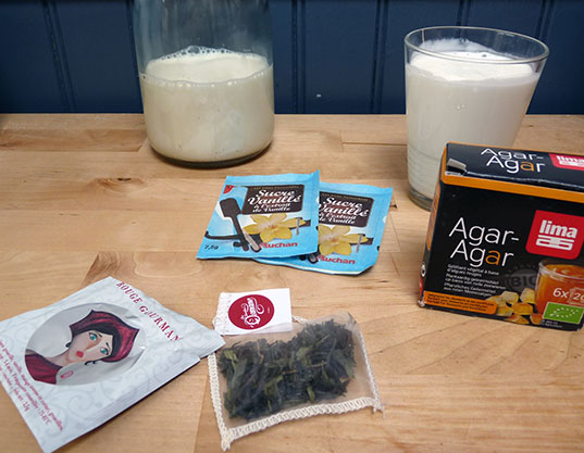 - 2g d’agar agar (L’agar agar est une algue qui sert de gélifiant. Il remplace la gélatine pour une version végétarienne de la panna cotta)(parce que n’oublions pas que la gélatine c’est quand même des os et de la peau d’animaux : pas très ragoûtant)