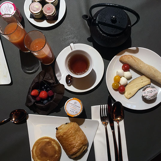 Bon et puis, pardon papa, je sais que là aussi c’est des déchets inutiles mais on a aussi profité des capsules Nespresso offertes. Bah oui, il n’y avait pas de bouilloire (booouuuh). Et sur la carte du room service, le thé était indiqué à 12€. Alors que c’est du Palais des Thés hein ! C’est bon mais ce n’est pas un thé ultra rare d’un petit producteur japonais. Bon en même temps, avec un petit paquet de Haribo à 8€ et des fraises séchées à 14€, un autre prix m’aurait étonnée. Et puis de toute façon, si on avait grignoté, on n’aurait plus eu faim pour le petit dej de folie le lendemain matin. Vous imaginez un buffet avec tout ce que vous voulez à disposition ? Des laits de toutes les sortes, des pancakes (j’en ai rarement mangé d’aussi bon), du saumon, du fromage, des fruits, des viennoiseries, des petits pains, des œufs préparés de toutes les manières que vous pouvez imaginer… Autant vous dire que je n’ai pas mangé le midi.