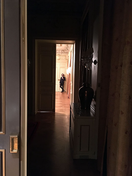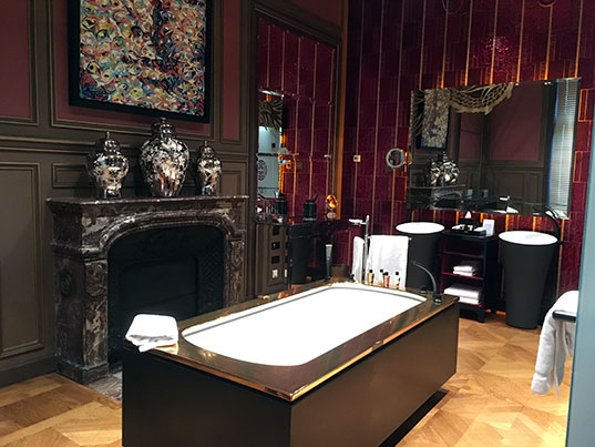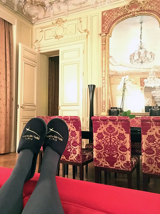 Bon et si la chambre avait fait 9m2, on aurait été un peu à l’étroit avec ce gros lit au milieu. Du coup, on n’a pas dormi dans une chambre mais dans une suite. De 110m2. Avec un salon où on pouvait organiser un repas pour 12 convives. Oui oui, c’est plus grand que ma maison. T’as pas intérêt à oublier tes chaussettes à l’autre bout de la pièce quoi, parce que c’est trop fatigant d’aller les chercher. Bon de toute façon, pas besoin de chaussettes, pour ne pas avoir froid aux pieds, tu peux glisser tes pieds dans les douces pantoufles mises à ta disposition. Ça fait plus chic sur le parquet Versailles !
