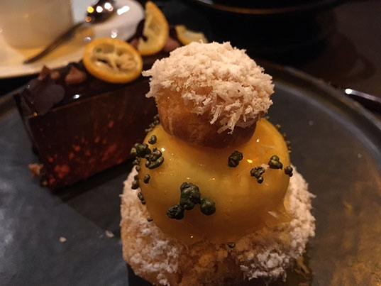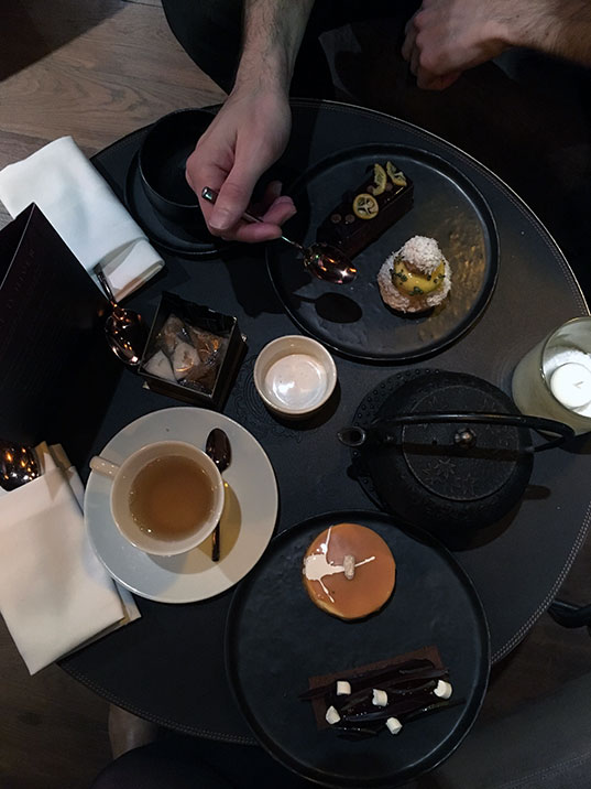 Pour la partie sucrée, dur dur de choisir tellement tout avait l’air bon. Du coup, comme il y avait cinq possibilités, on en a pris deux chacun et on a partagé. J’ai adoré la bûche au cédrat et au yuzu, ultra fraiche et acidulé. La religieuse exotique, coco, mangue et passion était aussi parfaite. Et je suis tombée amoureuse de l’entremet au chocolat, sésame noir et orange. Un parfait délice ! J’ai moins aimé la tarte caramel et cacahuète mais bon, c’est vraiment parce que tout le reste était si parfait qu’elle m’a semblé un peu trop « commune ».