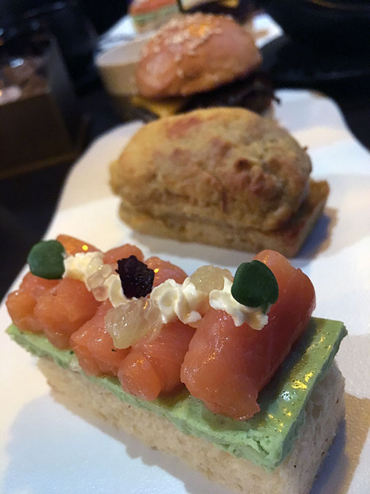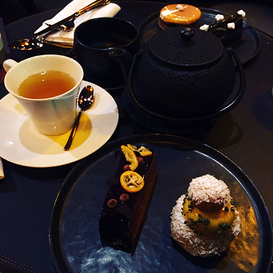 Trois mignardises salées et deux petits desserts, accompagnés d’un thé ou d’un café, ça fait beaucoup pour un goûter. Pour Noël, le Buddha Bar propose une version spéciale fêtes de son teatime avec foie gras, saumon fumé, truffe et bûche au programme. Comme je suis casse-pieds, j’ai demandé une version sans viande et le chef en cuisine s’est décarcassé pour accéder à mes désirs (pardon papa mais c’est quand même pratique de faire croire qu’on est riches). Bon par contre, mon amoureux a été un peu déçu parce que lui aussi a eu le droit à la version sans viande : avec du tofu à la place du foie gras, il m’a un peu détestée ! Tout était absolument délicieux : saumon fumé des îles Féroé, crème de shizo vert et citron caviar, mini burger aux truffes avec un falafel (à la place du poulet) et de la mangue et cake au tofu et aux épices absolument délicieux.