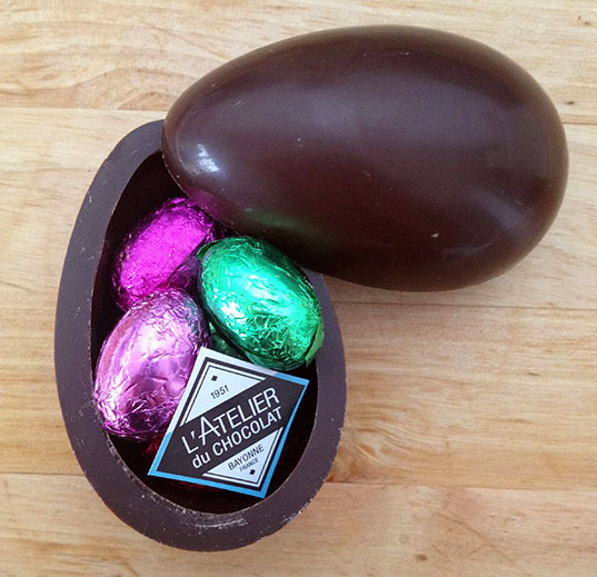 Et bien, elle est fort jolie, sur le thème de la mer. Pas grand rapport avec Pâques me direz-vous mais au moins ces baleines et ces étoiles de mer changent un peu. Et pour les traditionalistes, pas d’inquiétude, on retrouve aussi des œufs en chocolat, des poules et des lapins. Il y a même une petite boîte remplie de vraies coquilles d’œufs fourrées de chocolat. Moi qui n’arrive même pas à écaler proprement un œuf dur, je suis épatée.
