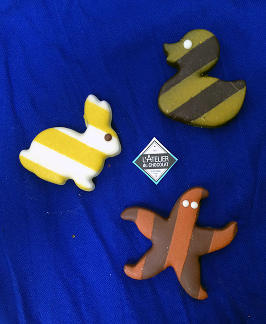 J’ai particulièrement craqué pour l’étoile de mer au sucre pétillant et le canard fourré pain d’épices-orange (bon et puis aussi pour les petits œufs chocolat au lait fourrés à la ganache framboise)(et aussi ceux à la pistache) Bref j’ai craqué quoi. J’ai même beaucoup aimé le canard chocolat blanc-noix de coco (alors que je n’aime pas tellement le chocolat blanc mais comme je suis une fille sympa, je l’avais acheté pour mon amoureux)(mais j’ai du me retenir de ne pas tout manger du coup).
